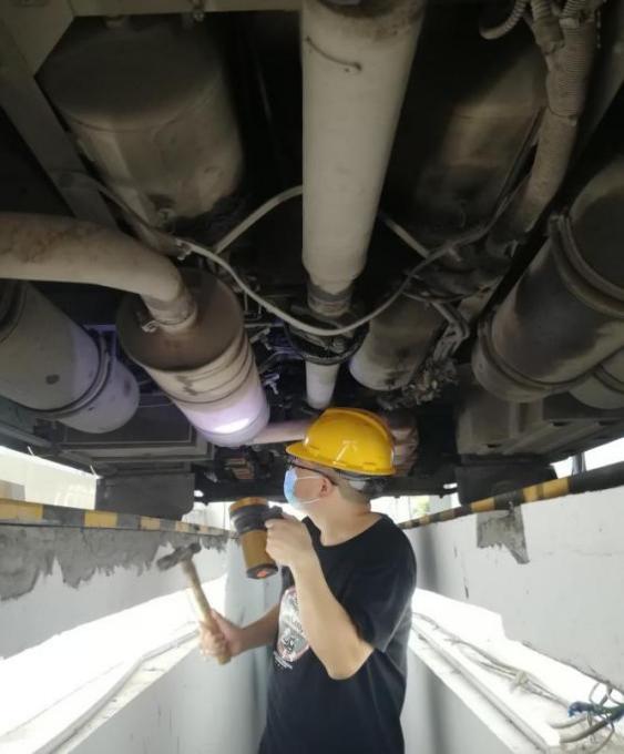 一把榔頭只為堅(jiān)守源頭安全。在車(chē)站車(chē)輛例檢處,例檢員劉海正在烈日下作業(yè),滾燙的水泥地面、發(fā)熱的客車(chē)底盤(pán)和客車(chē)尾氣讓車(chē)輛例檢臺(tái)溫度更高。劉海不停地在車(chē)輛底部鉆進(jìn)鉆出,從燈光、轉(zhuǎn)向、制動(dòng)、底盤(pán),到車(chē)胎、螺絲、安全帶、消防錘等,認(rèn)真檢查著每一個(gè)車(chē)輛部件??蛙?chē)底部的高溫讓他下去一次便全身濕透一次,臉上的汗也順著頭發(fā)往下滴落。說(shuō)起自己的工作,劉海認(rèn)為雖然工作環(huán)境惡劣一些,但是與售票員、檢票員并沒(méi)有什么不一樣,只是分工不同,做好車(chē)輛例檢工作,保障客車(chē)運(yùn)行安全,是我們的責(zé)任,目的都是為旅客出行服務(wù)。